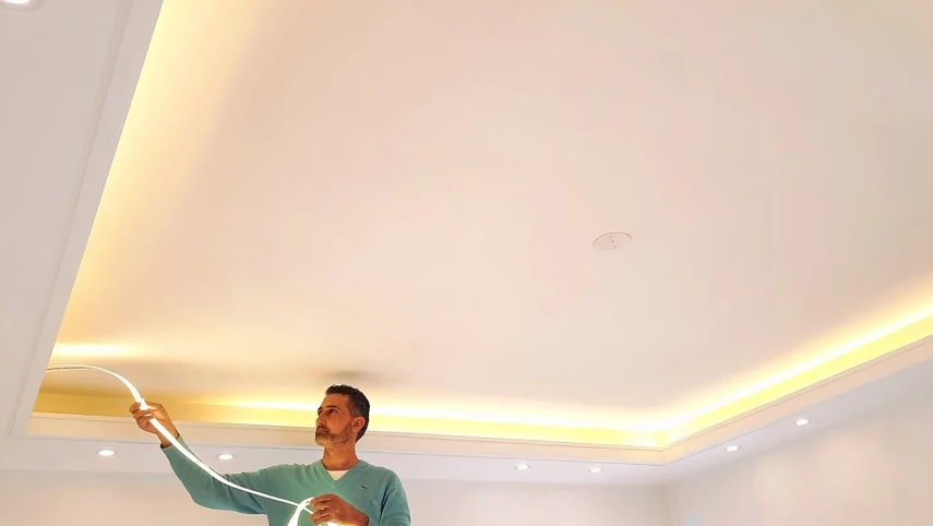 Cove Lighting Frame Kayu: Buat drop ceiling minimalis di sekeliling ruangan untuk menyembunyikan cove lighting. Lapisi drop ceiling yang sempit ini dengan plafon PVC tekstur kayu. Ini membuat plafon putih di tengah terlihat seperti mengambang dan berbingkai kayu, memberikan kesan mewah dan hangat.