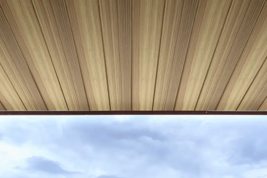 Lapisan Laminasi Kayu Terbaik: Plafon PVC tekstur kayu JAVAFON menggunakan lapisan laminasi berkualitas tinggi yang meniru serat kayu terang secara realistis, tanpa terlihat artifisial.