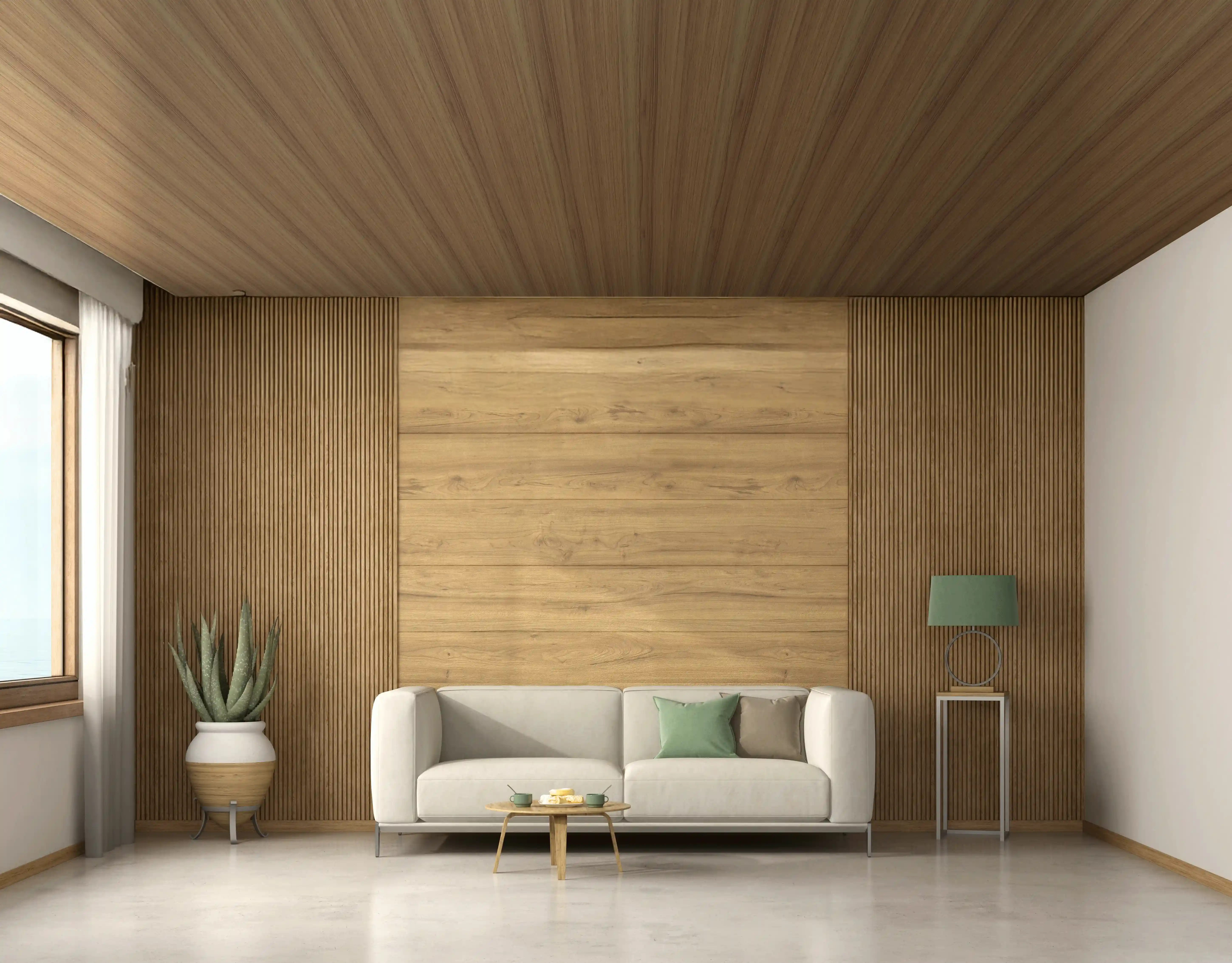 Warna Konsisten: Plafon PVC menjamin warna kayu terang tidak akan berubah gelap atau kusam seiring waktu, yang merupakan hal yang wajib dipertahankan dalam desain Scandi.